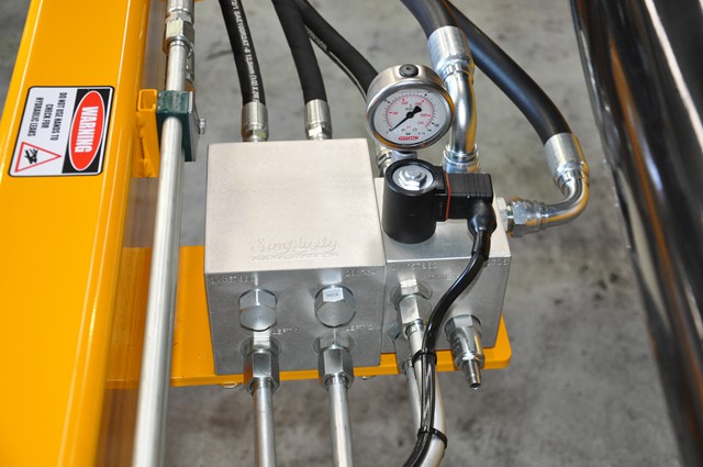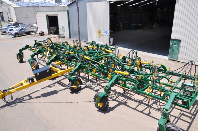 To incorporate the floating hitch, the rear wheels are moved one row further back. Still being inside the frame footprint, the rear wheels still bear the majority of the weight, allowing the front castors to primarily maintain level and ensure floatation. The front castor wheels are connected to the rear axles via a linkage and bell crank mechanism meaning only a single set of hydraulic cylinders is required for lifting the bar. Using this mechanical single ram design ensures oil flow required for lifting is kept to a minimum and adjustment is simple and reliable.