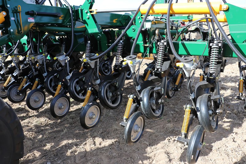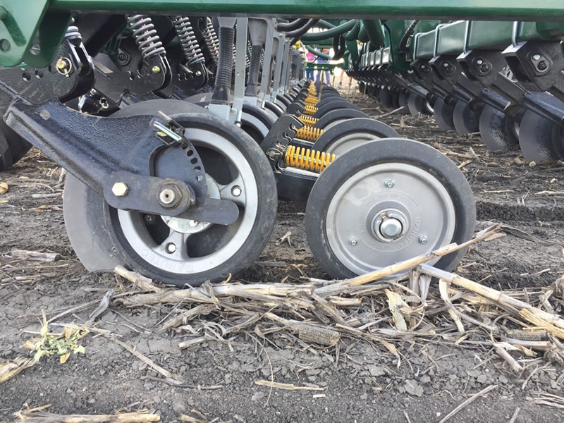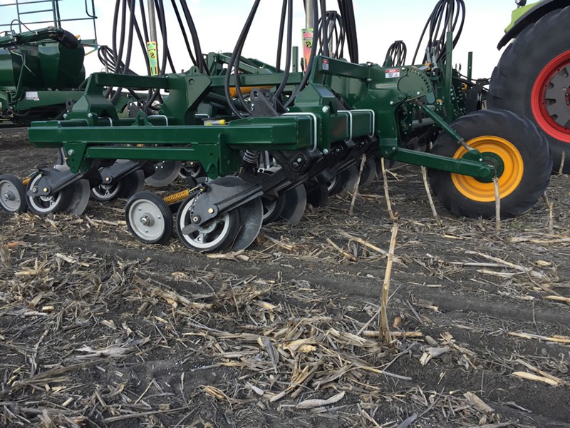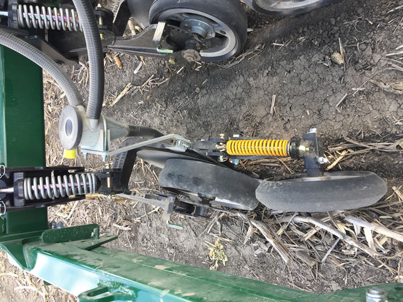 Quick Setting Capability- Applying down pressure on the disc and the press wheel is done with independent spring bodies that are easily transitioned to different positions. The different positions alter the geometry to incrementally increase or decrease the down force. No manual spring tensioning or loosening is required to alter operation pressures. This system also includes ‘transport’ or ‘non-working position for different row spacing options.